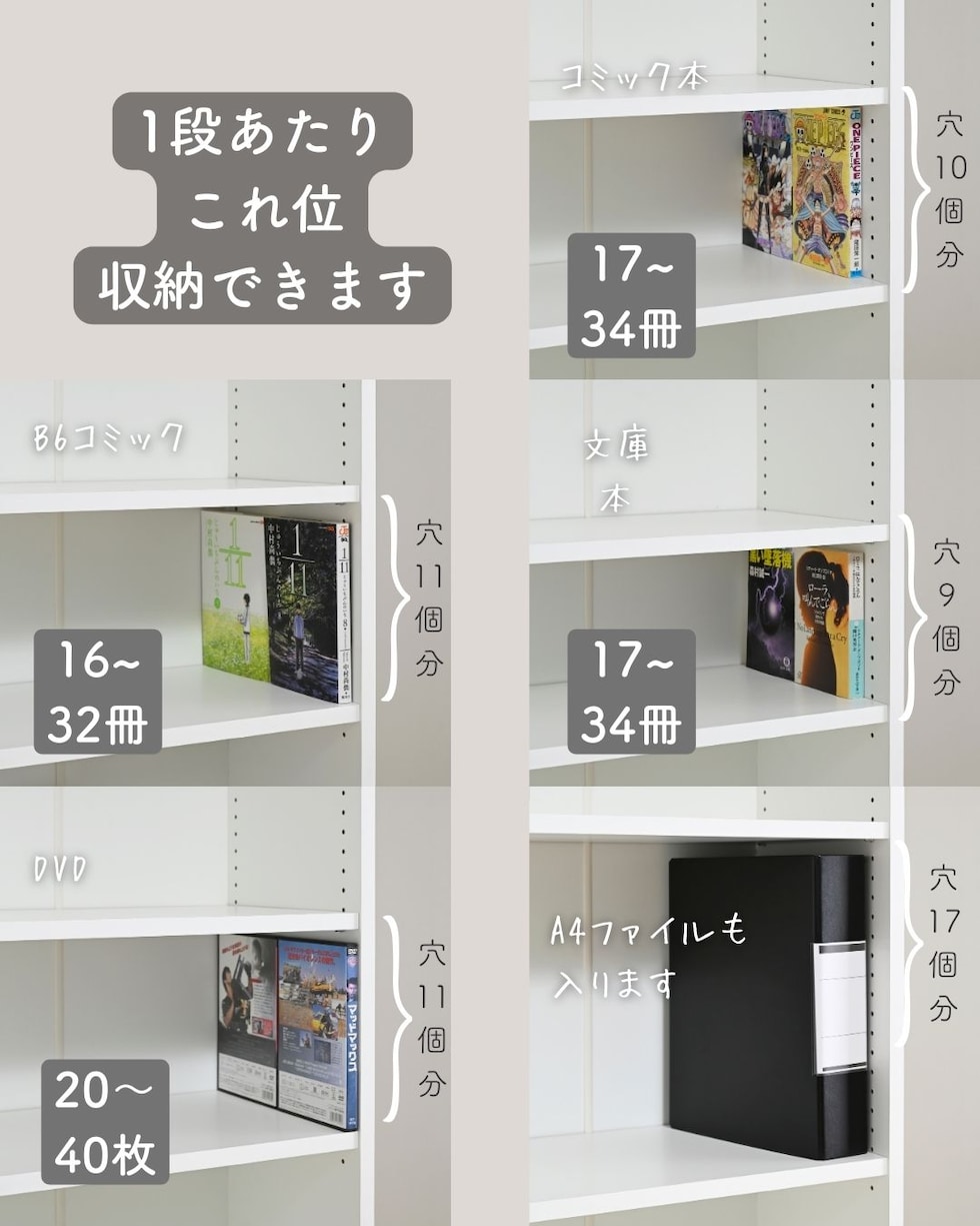 ●分割式可動棚計6枚、2cm間隔、上部26段階・下部28段階調節