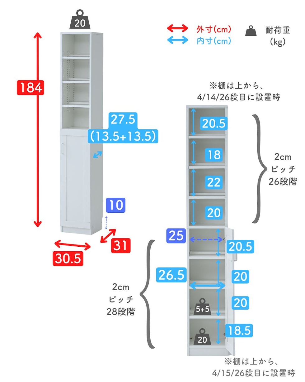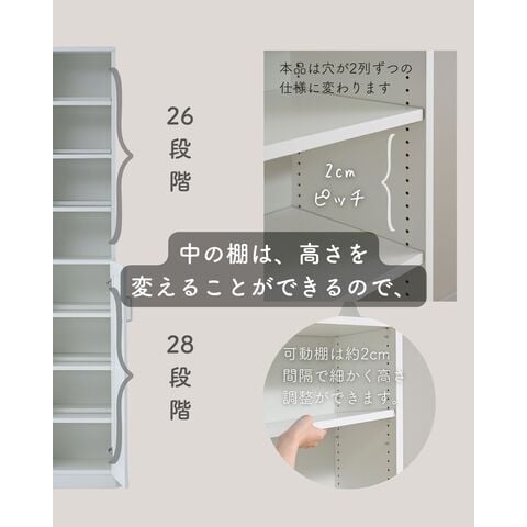 ●上段・棚板間高さ: (手前/奥) 20.5/18.5、18/18、22/22、20/22cm ※棚は上から(手前/奥) 4/3段、14/13段、26/25段目に設置時