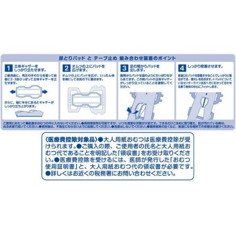 | 材質 | 表面材:ポリオレフィン系不織布 吸水材:綿状パルプ/吸収紙/高分子吸水材 防水材:ポリエチレンフィルム 止着材:ポリプロピレン 伸縮材:ポリウレタン 結合材:ホットメルト粘着材 |