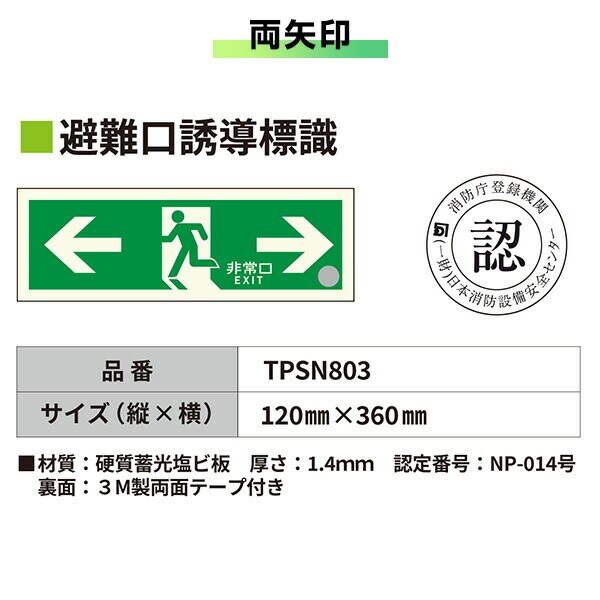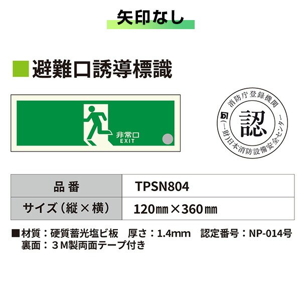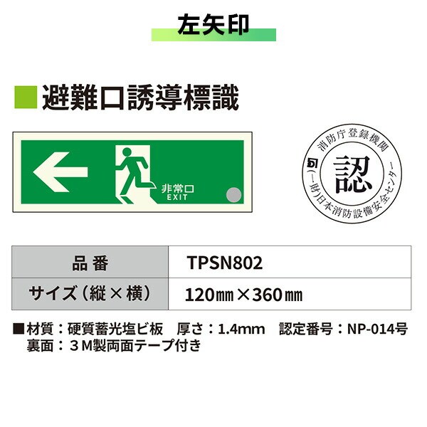 | エルティーアイ LTI 中輝度 蓄光式 避難口誘導標識 消防認定品 両面テープ付き TPSNシリーズ 硬質塩ビ板タイプ TPSN801/802/803/804 |