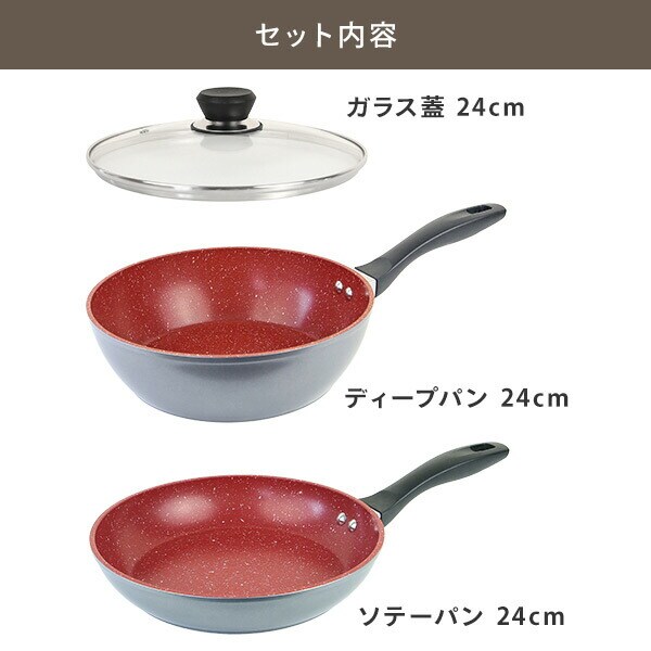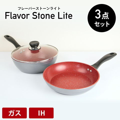 フライパン フレーバーストーンライト 3点セット レッド ソテーパン ディープパン ガラス蓋 蓋 ふた フタ フライパンセット セット 軽量 軽い ガス IH 24cm 深型 テレビショッピング研究所 【送料無料】