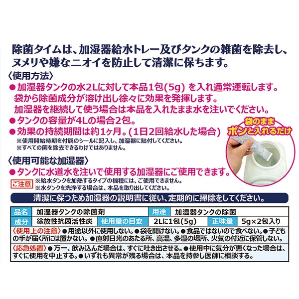 | 商品説明 | ●給水タンクに袋のままポンと入れるだけで簡単除菌 ●加湿器内の雑菌を除去しヌメリ防止 ●安全性の高い自然由来の活性炭を使用 ●タンク内の消臭効果も! ●使用量の目安:加湿器タンクの水2Lに対して本品1包(5g) ●効果は約1ヶ月持続 (1日2回給水した場合) ※すべての菌を除去するわけではございません ※こちらの商品は、2025年9月8日より下記リニューアルをしております 活性炭をプラス 入数:10g×3包→5g×2包 |