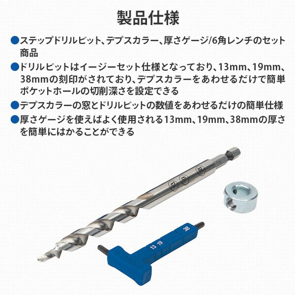 商品説明 ●ステップドリルビット、デプスカラー、厚さゲージ/6角レンチのセット商品