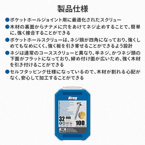 | Kreg ポケット ホール スクリュー 32mm 細目 100本入 SML-F125-100-INT |