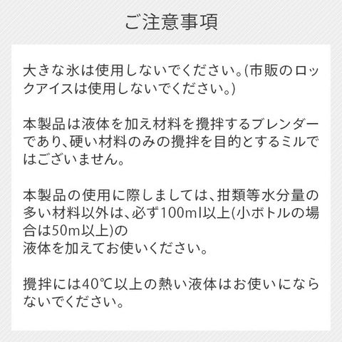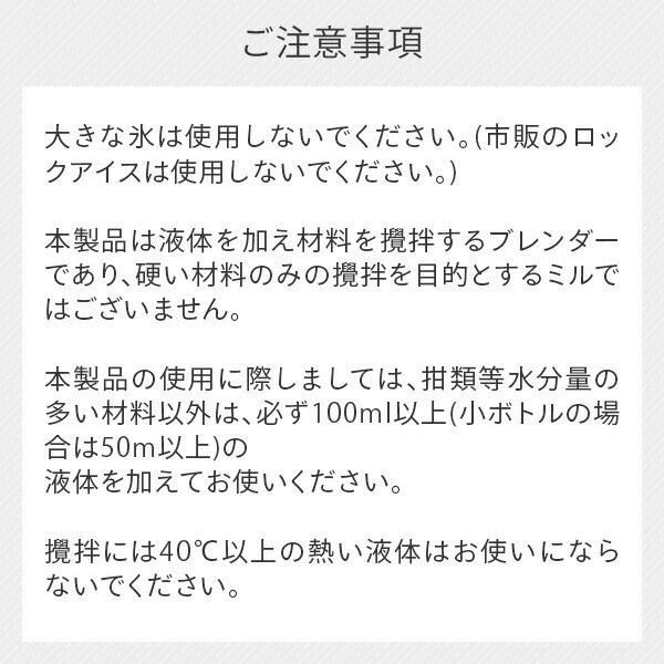 | 商品説明 | ●氷も砕くことのできるパワフルモータを採用したブレンダー。2つの回転速度で氷などの硬い食材から、野菜や果物などの柔らかい食材まで滑らかにすることが可能 ●200mlと400mlの2種類のボトルが付属!用途に合わせて容量を選ぶことができる ●回転スピード切り替え機能付き。低速・高速のワンタッチ切り替えボタンで好みや食材にフィットしたブレンディングが楽しめる(低速:約15000回転/分、高速:約19000回転/分) ●付属の2種類のボトルは円錐状でリブがついているため、ボトル内で食材がかくはんしやすい設計になっている ●安心・安全設計!Wスイッチ構造(安全機構)を採用することで、ボトルを正しくセットしないと動作しない仕様になっている 【仕様】 ●消費電力:280W ●電源:AC100V 50-60Hz ●回転スピード:低速(約15000回転/分)、高速(約19000回転/分) ●連続使用可能時間:1分間 ●コード長さ:2.0m ●容器容量:400ml×1、200ml×1 ●付属品:ブレードケース、大ボトル×1個、 小ボトル×1個、ドリンクリッド×2 、取扱説明書(保証書付き)、レシピブック |