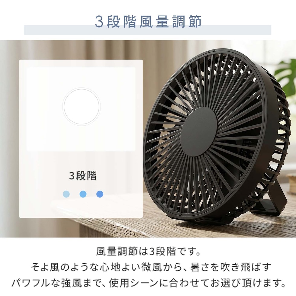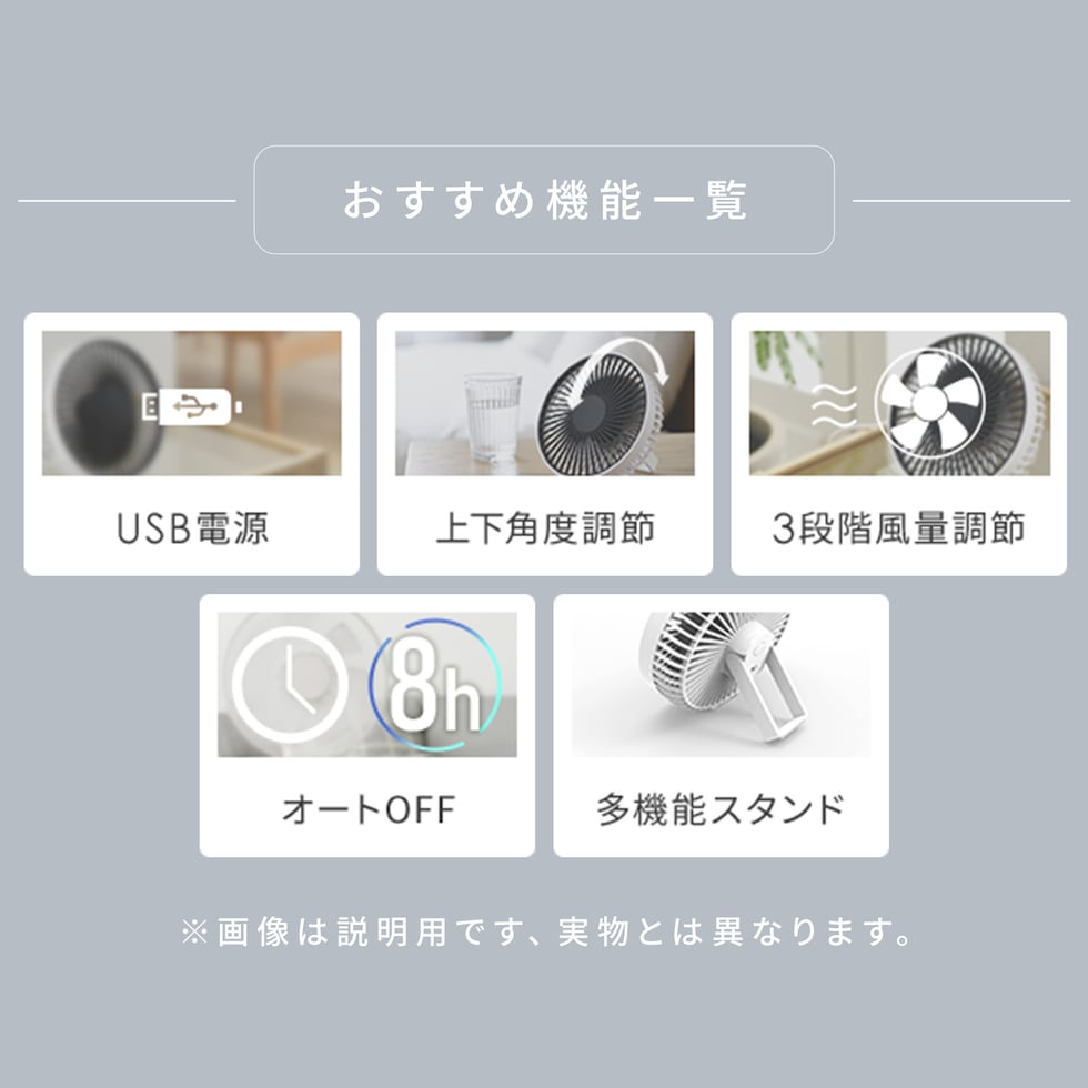 | 商品説明 | ●電源:USB電源(DC 5V) ●消費電力:最大3.5W※ACアダプタ使用時 ●風量3段階:弱・中・強 ●角度調節:最大45° ●切タイマー設定:約10時間で自動オフ ●羽根サイズ:約11cm(5枚羽根) ●引っ掛けて使うこともできるスタンド付き ●羽の掃除ができる取り外し式前面ガード採用 ●モバイルバッテリー使用で、コードレス使用が可能 ●付属品:USBケーブル、取扱説明書兼保証書 ●メーカー保証:1年間 ※2026年3月発売分より型番・カラーバリエーションが変更になっております |