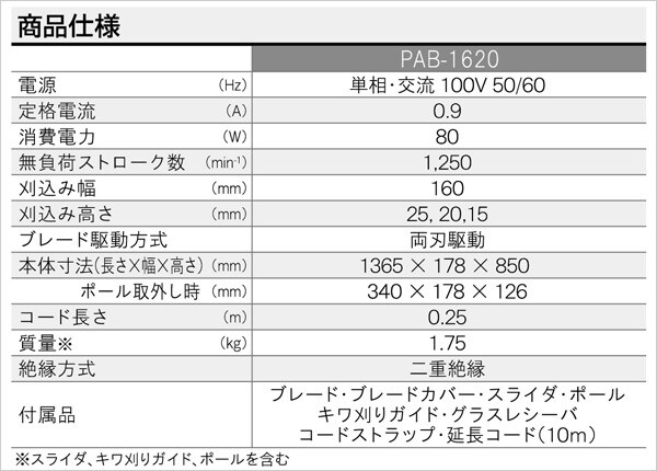 | 商品説明 | ●刈込幅:160mm (両刃駆動) ●ストローク数:毎分1250 ●刈込高さ:15・20・25mm の3段階調節可能 ●電源:単相100V ●電流:0.9A ●消費電力:80W ●付属品:ブレードセット(本体取付)、ブレードカバー(本体取付)、スライダ(本体取付)、キワ刈りガイド(本体取付)、ポール、延長コード10m、コードストラップ(ベルトフック付)、グラスレシーバ ●立ったままの姿勢で楽に作業 ●ポール角度、5段階調節可能 ●ポールと本体をワンタッチで簡単に取り外しできる ●両刃駆動 |