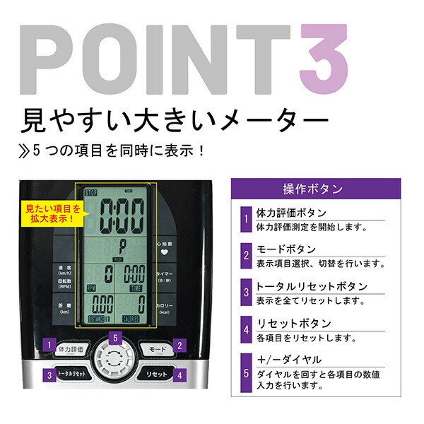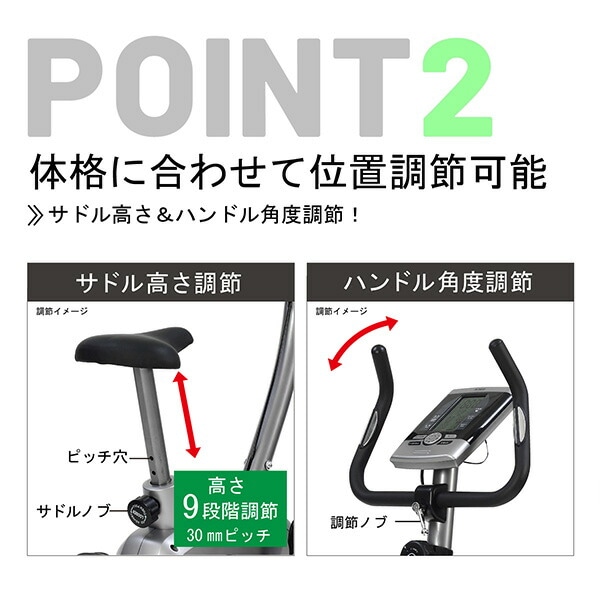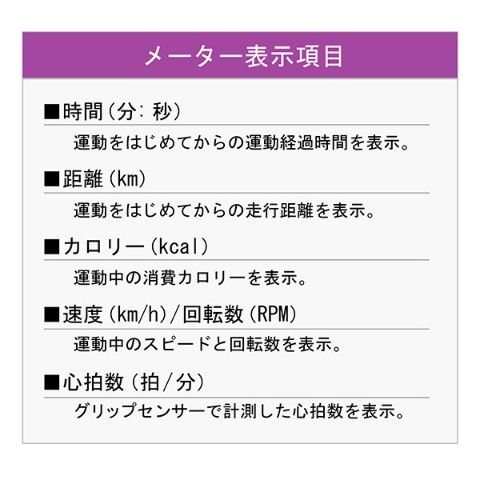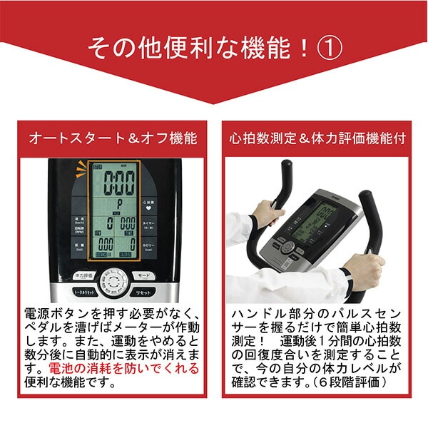 | 商品説明 | ●心拍数の測定ができ、効果的な運動をサポート(ハンドパルスセンサー方式) ●サドルの高さ調節とハンドルの角度調節が可能、ベストポジションで快適に運動ができる ●マグネット負荷ベルト駆動による、スムーズな回転と静音化を実現(負荷調節8段階) ●運動によって上昇した脈拍数が1分間でどこまで安静時に回復できるかを測定し、トレーニング効果の目安やその日の体調チェックが簡易測定できる体力評価機能付き ●脚の踏み外し防止のペダルバンド付き ●キャスター付きで移動がラクラク ●運動を始めると自動的に表示を開始するオートスタートと運動を中止してから数分後に自動的に表示が消えるオートパワーオフ機能を搭載 ●メーター表示:時間・速度/回転数・距離・カロリー・心拍数 ●電源:単3乾電池×2本使用 ●サドル高さ:75~93cm(3cmピッチ7段階) ●連続使用時間:30分 ●使用体重制限:90kg |
