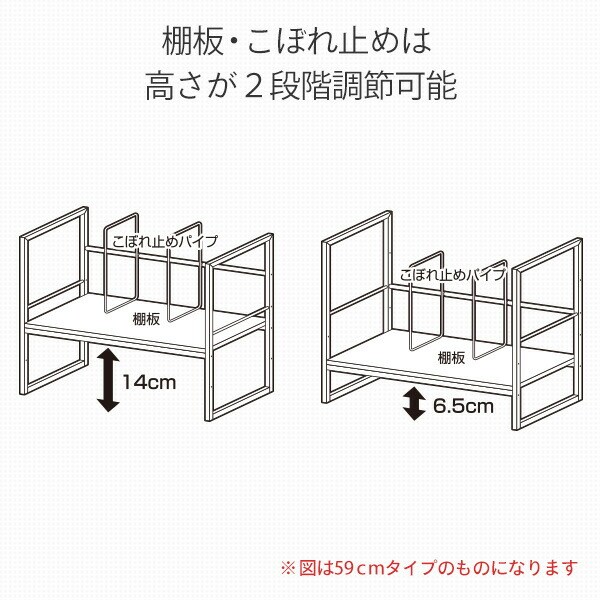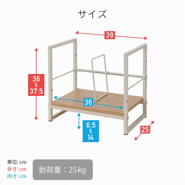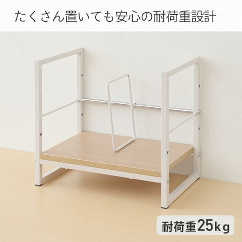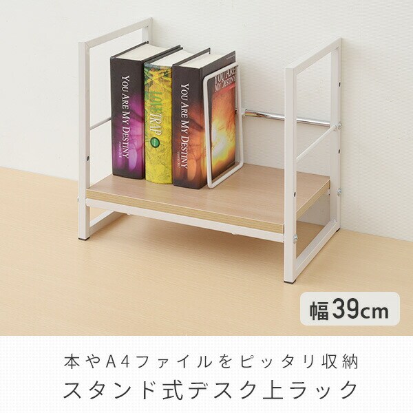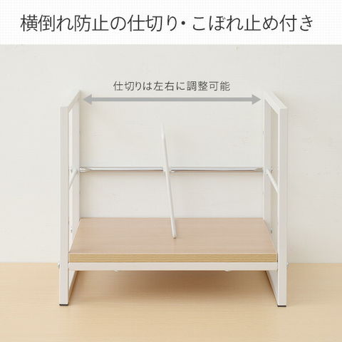 | 商品説明 | ●机の上にA4ファイルや本を収納する、スタンド式収納ラック ●仕切りやこぼれ止め付きで、横倒れを防止 ●仕切りは左右に調整可能 ●棚板とこぼれ止めは2段階で高さを選択可能 ●棚下内寸(下の場合):幅36 高さ7.5cm ●棚下内寸(上の場合):幅36 高さ14cm ●棚の下には補強パイプがあり、安心の耐荷重設計 ●耐荷重:25kg |