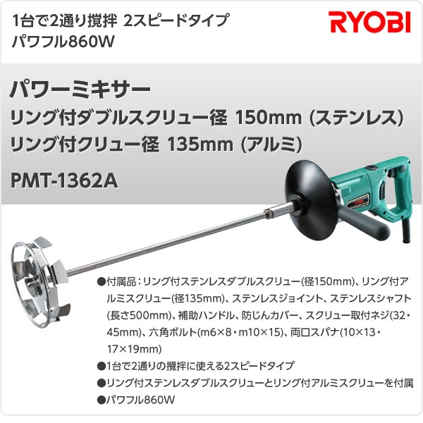 パワーミキサー リング付ダブルスクリュー径 150mm (ステンレス) リング付クリュー径 135mm (アルミ) PMT-1362A かくはん機 攪拌機 かくはん器 攪拌器 リョービ(RYOBI) 【送料無料】