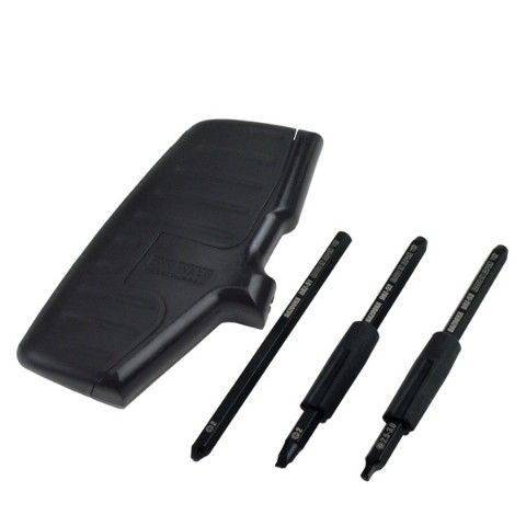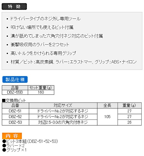 | 商品説明 | ●十字溝が潰れた皿ネジや六角穴付きネジにも ●外せるネジの例:皿ネジ、ナベネジ、トラスネジ、六角穴付ネジ(キャップボルト、皿ネジ、ボタンネジ、ホーローセット) ●十字溝のサイズ:本工具はNo.2のドライバーで回せるネジに対応 ●ドライバータイプのネジ外し専用ツール ●叩けない場所でも使えるビット付属 ●溝が舐めてしまった六角穴付ネジ対応のビット付属 ●衝撃吸収用のラバーを2つセット ●高いトルクをかけられる専用グリップ ●セット内容:ビット3本組(DBZ-51/DBZ-52/DBZ-53)、ラバー×2、グリップ×1 ●DBZ-51/DBZ-52:ドライバーNo.2が対応するネジ ●DBZ-53:対辺2.5-3.0の六角穴付きネジ |