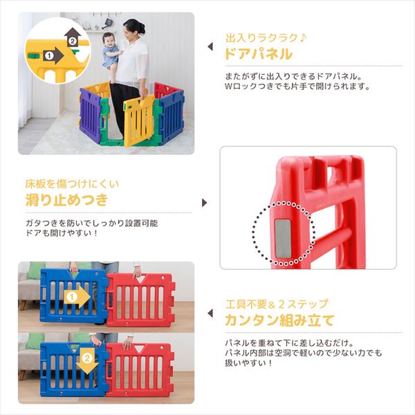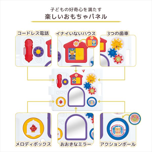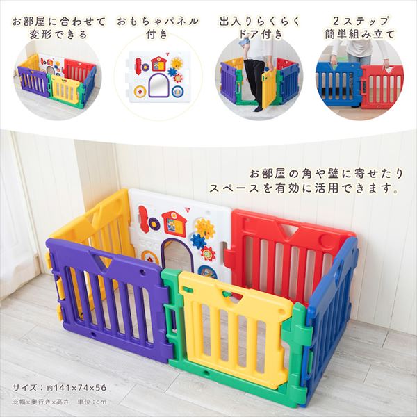 | 商品説明 | ●対象年齢:6か月-3歳半頃まで ●お部屋に合わせて自由に変形可能 ●楽しい仕掛けがいっぱいのおもちゃパネル付き ●全24曲のメロディ付き ●またがずに出入りできるドアパネルにはダブルロック付き ●工具不要の簡単組み立て ●床板を傷つけにくいすべり止め付き ●使わないときはコンパクトに収納可能 ●別売り追加パネルで大きくすることも可能 ※こちらの商品は2023年1月18日より下記変更をしております ・型番:5010006001→5010500001 ・パネル接続部変更 ・お部屋の形に合わせて正方形や長方形でのご使用もできるようになりました |