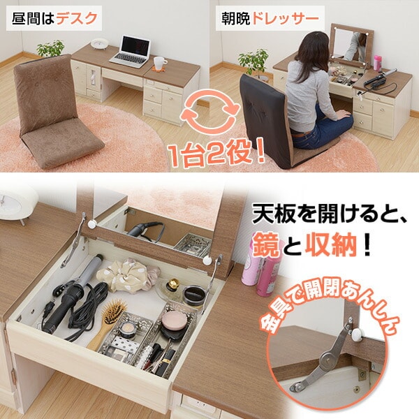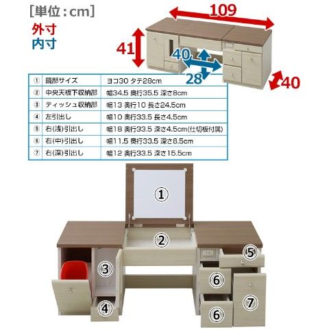 | 商品説明 | ●普段はローデスク、中央が開閉式の鏡になった、収納たっぷりのドレッサー ●コンセント、ゴミ箱、ティッシュ収納部までがオールインワン ●鏡部サイズ:ヨコ30 タテ28cm ●中央天板下収納部:幅34.5 奥行35.5 深さ8cm ●ティッシュ収納部:幅13 奥行10 長さ24.5cm ●左引出し内寸:幅10 奥行33.5 長さ4.5cm ●右(浅)引出し内寸:幅18 奥行33.5 深さ4.5cm (仕切板付属) ●右(中)引出し内寸:幅11.5 奥行33.5 深さ8.5cm ●右(深)引出し内寸:幅12 奥行33.5 深さ15.5cm ●本体下スペース:幅40 高さ28cm ●天板耐荷重:20kg ●中央天板下収納部:5kg ●1口コンセント付属(1500W) ●樹脂製ゴミ箱1個付属 |