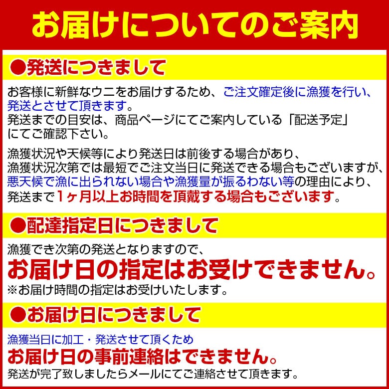 【商品詳細】北海道産の生エゾバフンウニを鮮度抜群、剥きたて塩水パックでお届けいたします!