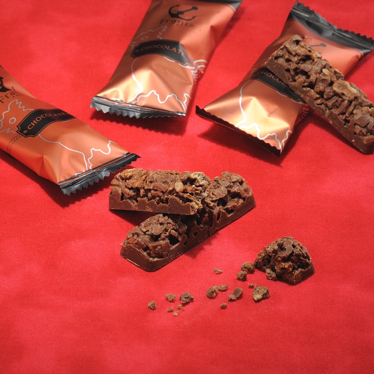 クランチチョコレートのザクザク食感 香ばしく焼き上げたワッフルコーン生地を、食感にこだわり少し粗めに砕いて使用。 神戸フランツオリジナルチョコレートと丁寧に混ぜ合わせることで、ひと口ごとにザクッと心地よい食感が広がるクランチチョコレートに仕上げました。 |