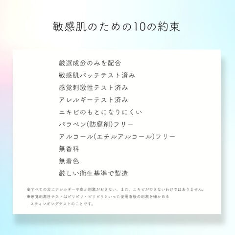 無香料、無着色、パラベン(防腐剤)無添加、アルコール(エチルアルコール)無添加、弱酸性、クリーン製法。