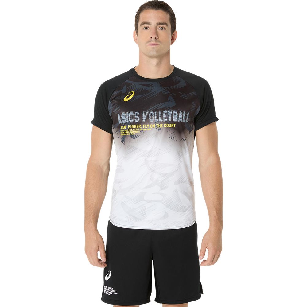 ●ACTIMOTION(アスリートの動きやすさを追求したアシックス独自のテクノロジー)を採用した半袖シャツ。シーズングラフィックを前面にプリント。