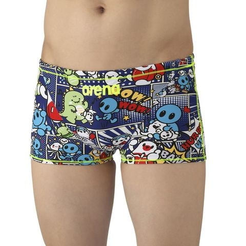 トレーニングカテゴリー「TOUGHSUITシリーズ」。ジュニア用サイズ。大会に向けて練習を重ねる頻度が高いスイマーにオススメの練習用水着。環境に配慮したリサイクルポリエステル素材「タフスキンEP」を使用し塩素に強く長持ち。全てのスイマーに人気のアリーナくんの総柄ショートレッグタイプ。AS5FWM01Mで展開するテーマ(宇宙や地球)と連動する冒険物語。アメリカンコミック調の柄は鮮やかな色合いとダイナミックな線が特徴でインパクトのあるデザイン。アリーナくんたちと地球外生命体(怪獣、宇宙人、お化け)が出会い、友達になる過程をプリントに表現。地球を守る戦隊ヒーロー風のスタイルを取り入れることで、アリーナくんたちのチームとしての一体感を演出。カラフルな4配色の展開。前身頃、後身頃共に黒の裏地付き。*この商品は縫製上、一点一点プリント柄の見え方に違いが生じますので予めご了承ください。