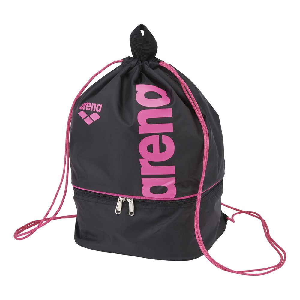 arenaロゴをスポーティにアレンジした2ルーム仕様のプールバッグ。 2ルーム仕様のため、持ち運びに困るサンダルを底部ルームに収納可能。またナップサック仕様なので、お子さんのスイミングスクールやプールの授業におススメ。