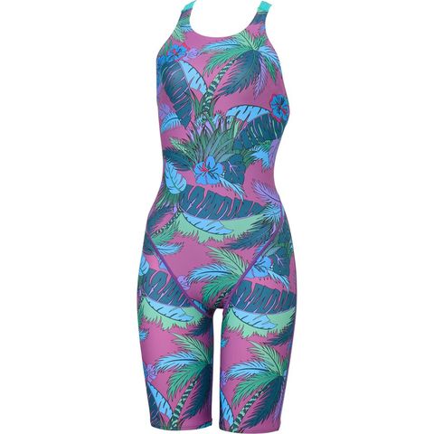 日々プールでトレーニングに励む学生やアクティブスイマーをサポートする、練習用スイムウエアコレクション「TurnS(ターンズ)」。肩への食い込みを軽減し、着脱のしやすさにこだわったレディースミニオープンバックニースキンです。毎日のハードなトレーニングを支える高い耐塩素性と、優れた4WAYストレッチ性。透けにくく安心感のある厚みと柔らかな風合いの環境配慮型素材「ENDURANCE ECO(エンデュランス・エコ)」を採用しています。露出控えめの小さな背穴。肩回りの動きを妨げにくいV字ストラップです。別売りのカップを使用できるフック受けが付いています(※カップは付属しておりません。SpeedoのハンギングスイムカップSE32001がオススメ)。前見頃に裏地付き。夏気分満点の鮮やかなヴィンテージ風ハワイアン柄。ストラップの色切り替えがバックスタイルを華やかに見せます。※1点1点プリントの見え方が異なりますので、あらかじめご了承ください。