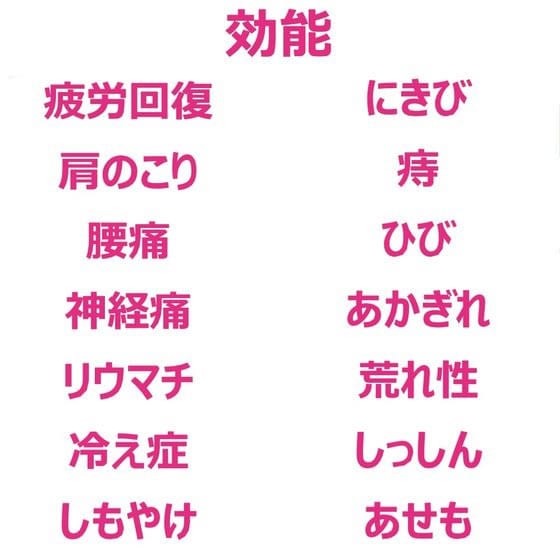 【効能】疲労回復、冷え症、肩のこり、あせも、しっしん、荒れ性、にきび、腰痛、神経痛、痔、リウマチ、しもやけ、ひび、あかぎれ