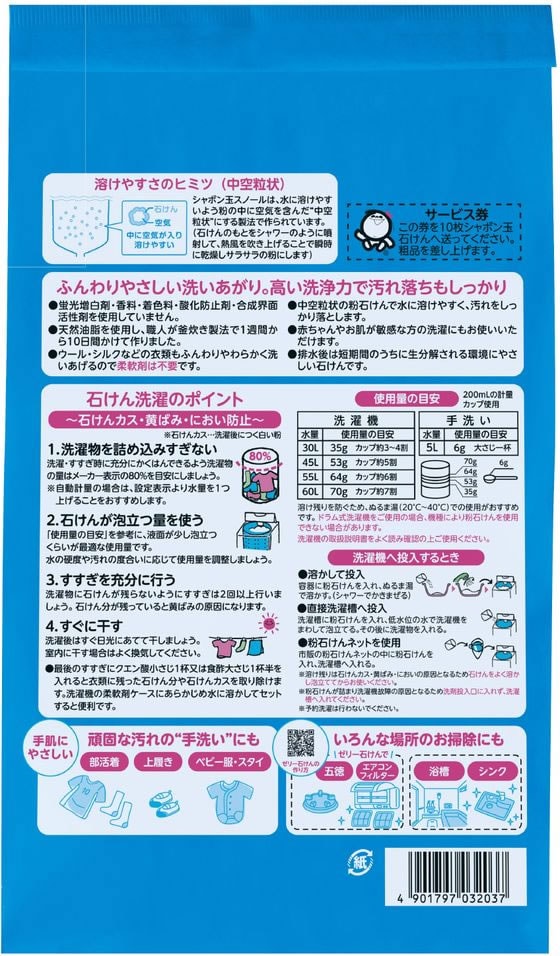 柔軟剤なしでふんわり。溶けやすい、高い洗浄力、自然にやさしい洗濯用粉石けん