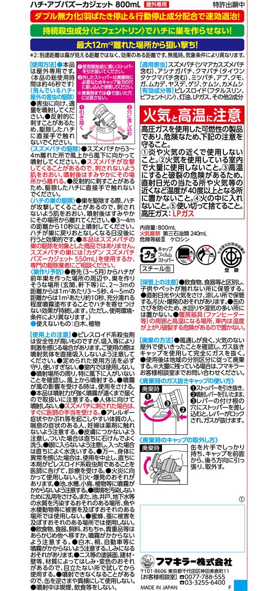 ●適用害虫:スズメバチ(ツマアカスズメバチ含む)、アシナガバチ、クマバチ(タイワンタケクマバチ含む)、ミツバチ、アブ、クモ、ガ、ムカデ、ヤスデ、ゲジ、ケムシ、カメムシ【使用上の注意】