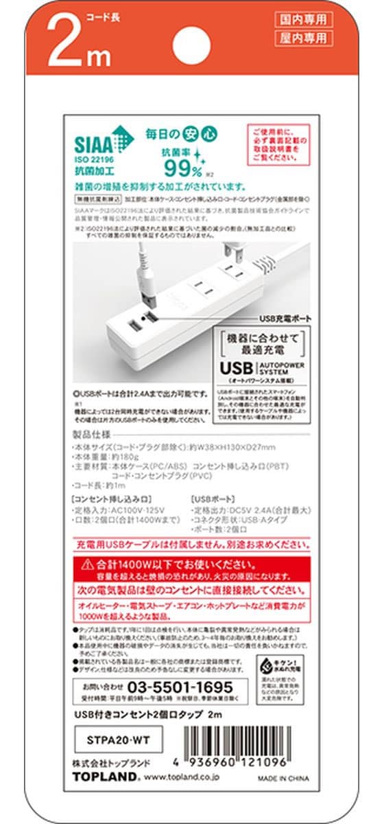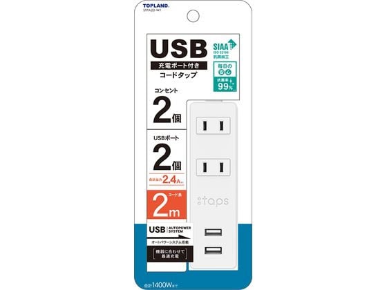 トップランド USB付きコンセントタップ2個口 2m STPA20-WT