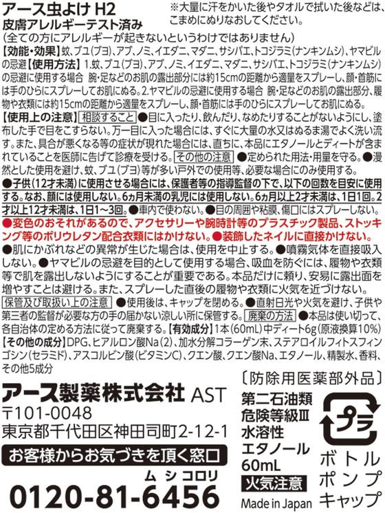 【効能・効果】蚊、ブユ(ブヨ)、アブ、ノミ、イエダニ、マダニ、サシバエ、トコジラミ(ナンキンムシ)、ヤマビルの忌避