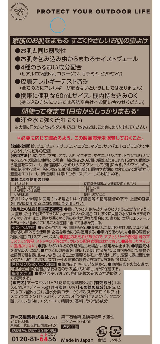 お肌を包み込み虫からまもるモイストヴェール。4種のうるおい成分配合(ヒアルロン酸Na、コラーゲン、セラミド、ビタミンC)。