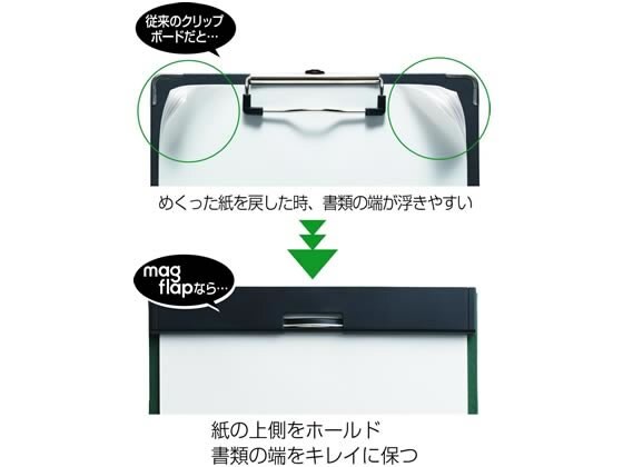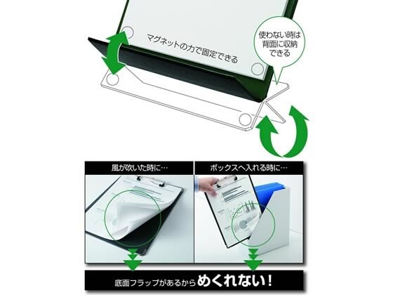 「背面フラップ」は挟んだ書類をめくった際にマグネットで固定できるため、立ちながらでも手で紙をおさえずに閲覧や書き込みができます。「底面フラップ」は、書類の下側をマグネットで固定し、書類の不意なめくれを防ぎます。未使用時は本体裏側に収納できます。クリップは「全長クリップカバー」付きで、書類の上側を両端までしっかり押さえられます。