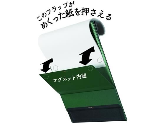 「背面フラップ」は挟んだ書類をめくった際にマグネットで固定できるため、立ちながらでも手で紙をおさえずに閲覧や書き込みができます。「底面フラップ」は、書類の下側をマグネットで固定し、書類の不意なめくれを防ぎます。未使用時は本体裏側に収納できます。クリップは「全長クリップカバー」付きで、書類の上側を両端までしっかり押さえられます。