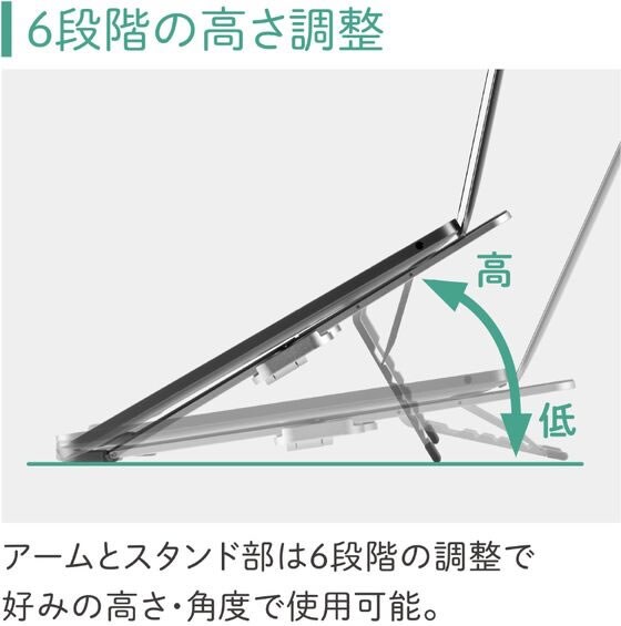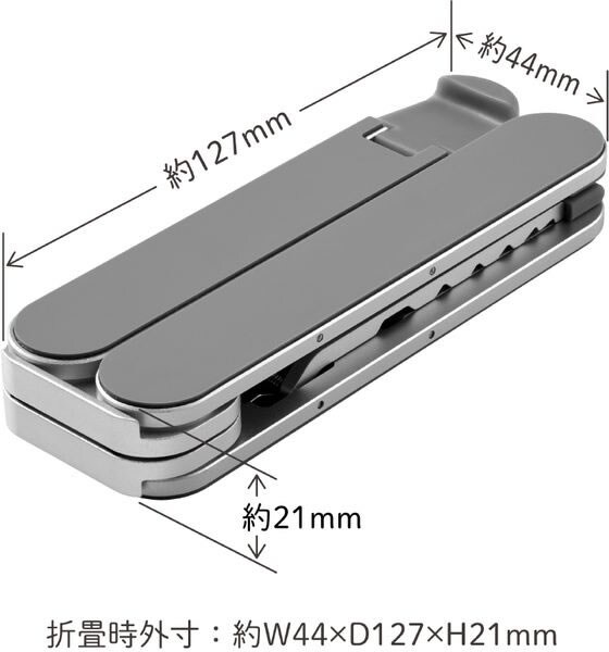 ノートパソコンやタブレットを置ける折畳式のノートパソコンスタンドです。折りたたむと超コンパクトな手のひらサイズで、質量も約190gと軽量なので持ち運びが簡単で自宅・オフィス・外出先と場所を選ばずどんなシーンでも便利にお使いいただけます。角度調整は6段階で調整可能なため、好みの高さ・角度で使用できます。