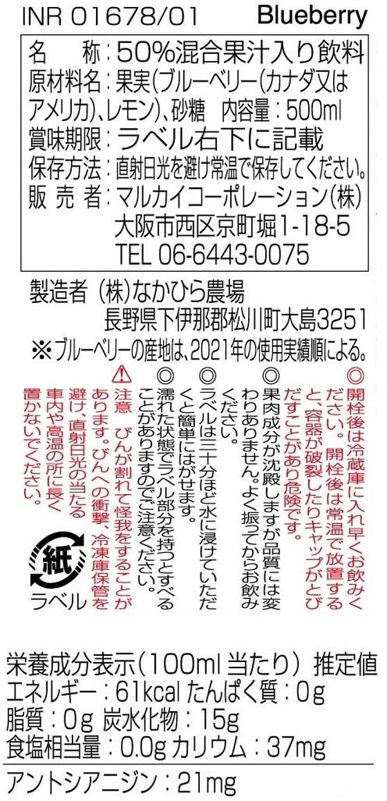 マルカイコーポレーション 順造選ブルーベリー 500ml 瓶 缶 果実飲料 ジュース 飲料