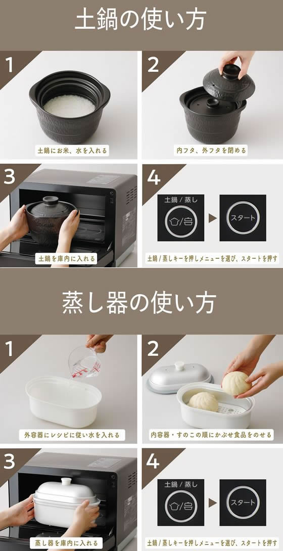 マイクロ波を遮断することで水蒸気のみで加熱が可能な本格蒸し器。蒸し器で冷蔵庫にある食材で調理可能。ゆで卵も作れます。土鍋ではご飯や煮物、カレー、インスタントラーメンも調理可能。