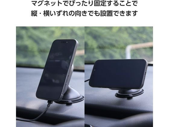 ●マグネットでスマートフォンをぴったり固定することで縦・横いずれの向きでも設置でき、スマートフォンのナビを使いながら充電できます。