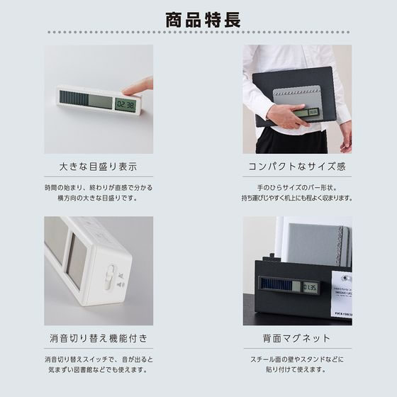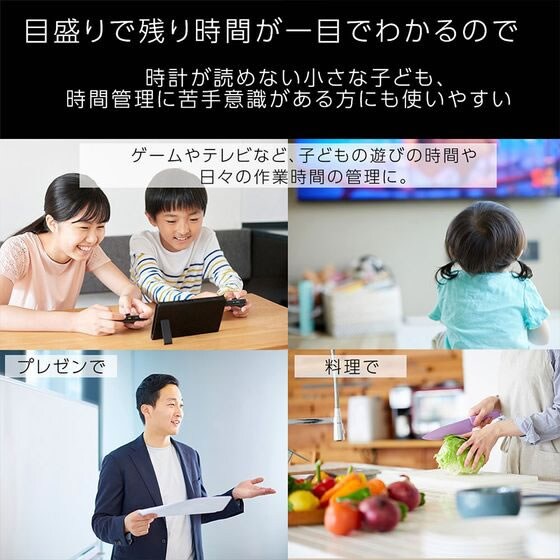 目盛りで残り時間が一目でわかるタイマー。バーのメモリで経過時間を可視化。