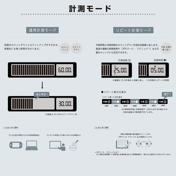 作業時間と休憩時間を交互に繰り返せるリピート計測モードで勉強や運動の時間管理「ポモドーロ・テクニック」などに活用できます。