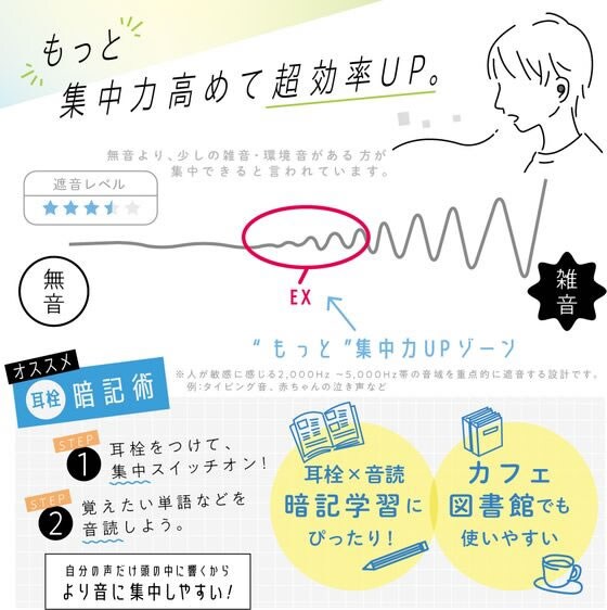 集中耳栓EXでもっと集中力高めて、めざせ!勉強効率アップ人が敏感に感じる高音域の遮音に効果的な設計
