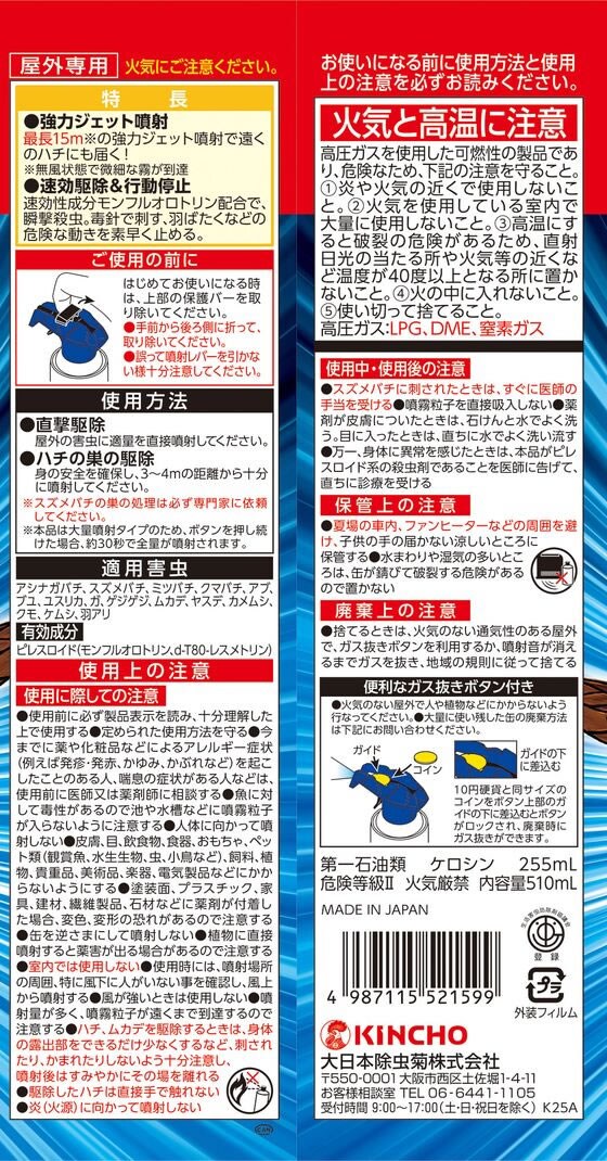 【適用害虫】アシナガバチ、スズメバチ、ミツバチ、クマバチ、アブ、ブユ、ユスリカ、ガ、ゲジゲジ、ムカデ、ヤスデ、カメムシ、クモ、ケムシ、羽アリ