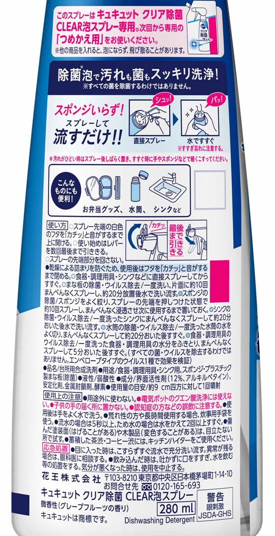 KAO キュキュット クリア除菌 CLEAR泡スプレー 微香性 本体 280mL 食器洗用洗剤 キッチン 厨房用洗剤 洗剤 清掃