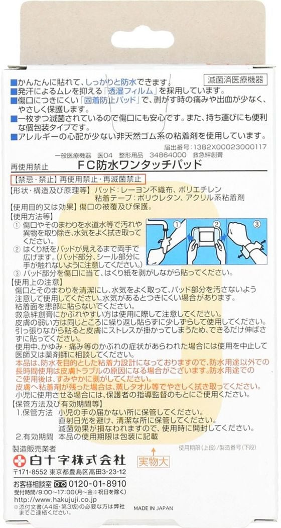 救急絆創膏・届出番号:13B2X00023000117、一枚ずつ包装しており滅菌済みですので、傷口に安心で持ち運びに便利です。 アレルギーの心配が少ない非天然ゴム系の粘着剤を使用しています。