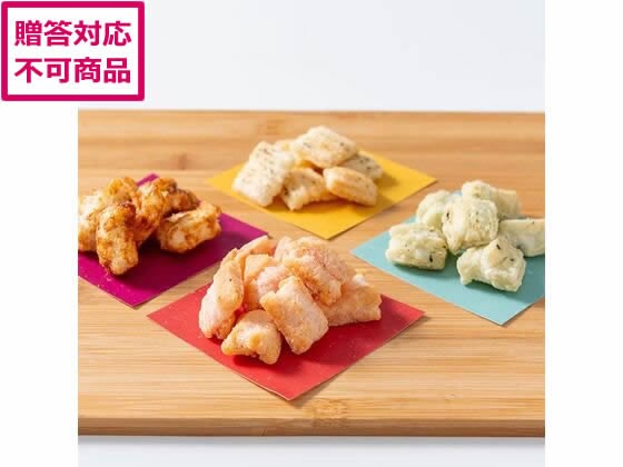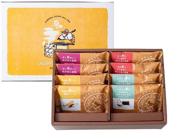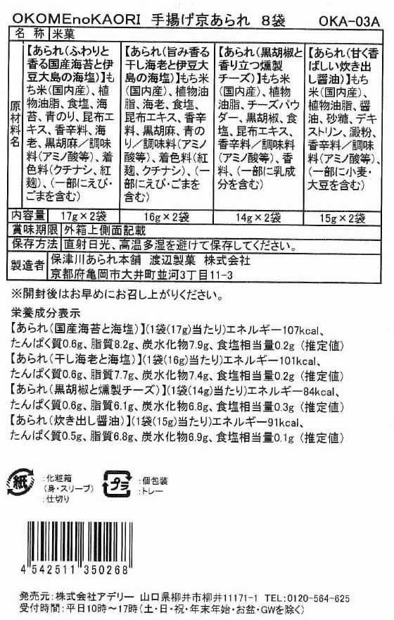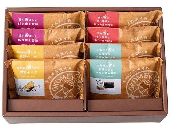 ●内容量:手揚げ京あられ×8袋(旨み香る干し海老と伊豆大島の海塩16g・甘く香ばしい炊き出し醤油15g・ふわりと香る国産海苔と伊豆大島の海塩17g・黒胡椒と香り立つ燻製チーズ14g×各2袋)、合計8袋