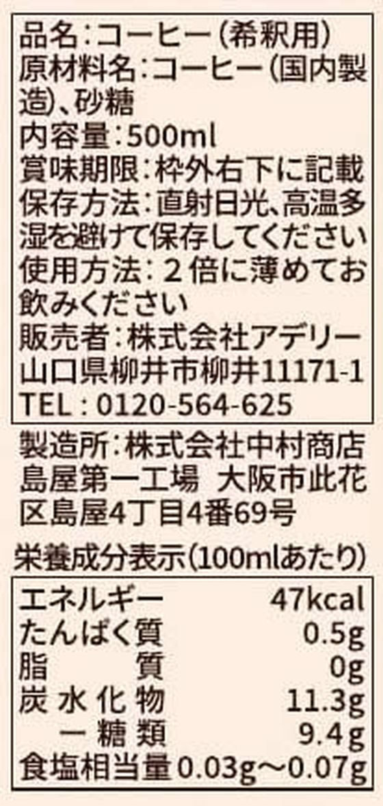 ●内容量:アイスコーヒー500ml(無糖)×2本、カフェオレベース希釈タイプ500ml(加糖)×1本、合計3本