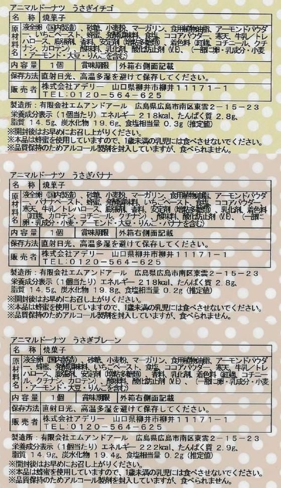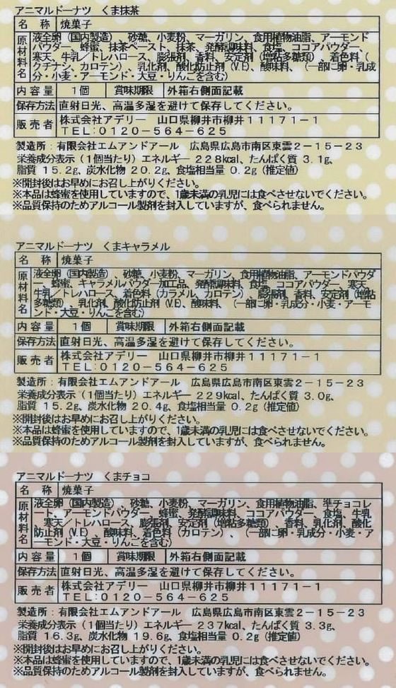 ●内容量:ハートの焼菓子(ラズベリー・チョコ×各2個)、アニマルドーナツ(うさぎプレーン・うさぎイチゴ・うさぎバナナ・くまチョコ・くま抹茶・くまキャラメル×各1個)、アーモンドボール・アーモンドココアクッキー×各1個
