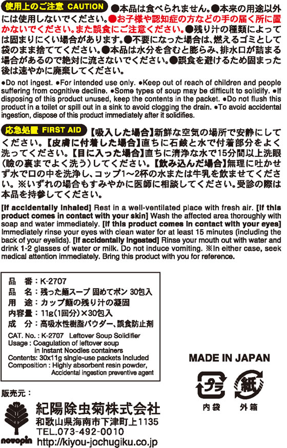 残った麺スープを固めて燃えるゴミとして捨てられるカップ麺残り汁の凝固剤です。油分や粘度の高いもの、食品のカスなどをそのまま排水管へ流すと排水管の詰まりや錆びの原因にもなります。ご家庭、オフィス、アウトドアなどの排水管をつまらせたくない、外出先で流すところがない時にオススメ。使用することで排水管を清潔に保ち、塩分や油分の過剰摂取を抑えて、健康的。普段使いにも、災害時にも。
