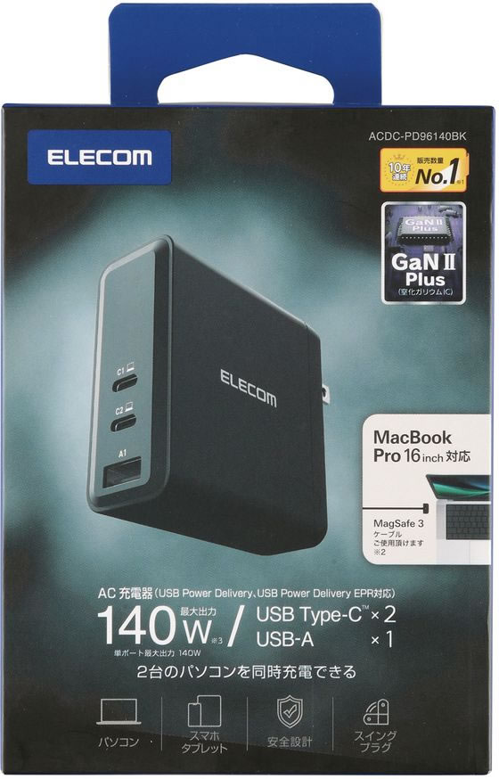 ●USB Power Delivery EPR最大140W(28V/5A) 出力対応USB AC充電器です。16インチMacBook Proを30分でゼロから50%まで高速充電可能です。
