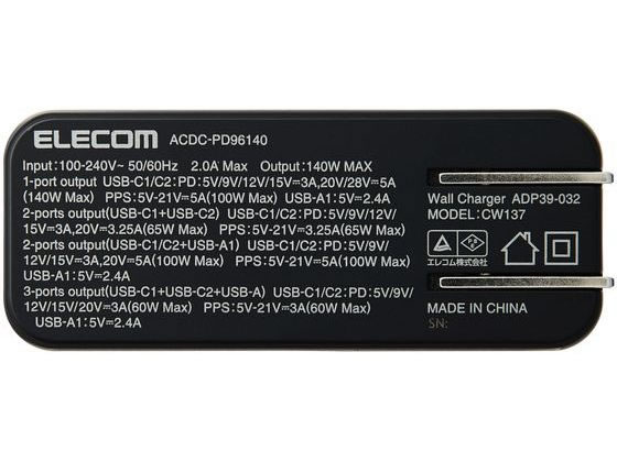 【お取り寄せ】 エレコム AC充電器 PD 140W 高出力 ブラック ACDC-PD96140BK AC式充電器 バッテリー 充電器 スマホ タブレット関連品