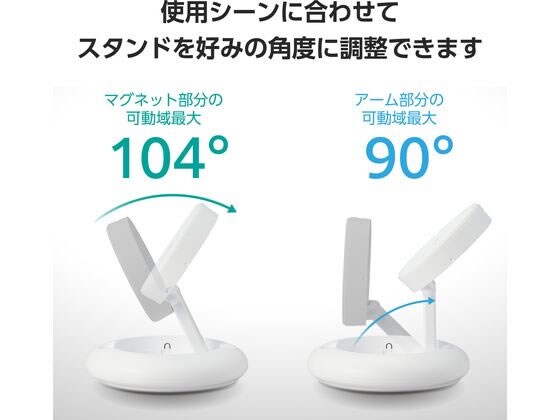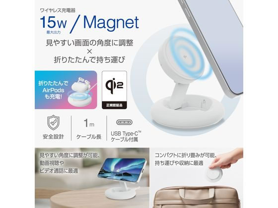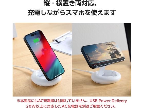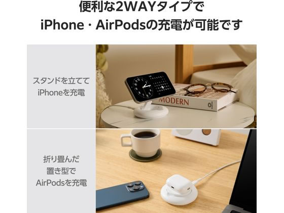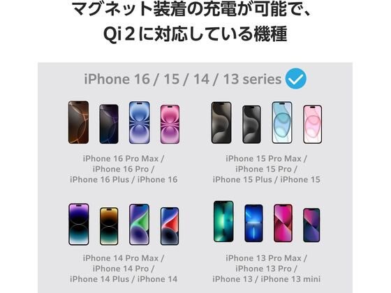 ●マグネットで固定するだけでQi2対応スマートフォンを高速充電できる、Qi2規格ワイヤレス充電スタンドです。最大出力15WでiPhoneを充電できます。