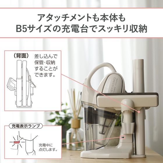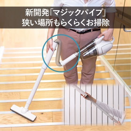 本体重量約1.0kgの軽量ながら、パワフルな吸引力のコードレスハンディクリーナーです。「マジックパイプ」で、お掃除がより簡単に。多彩なアタッチメントはB5サイズの充電台にすっきり収納できます。豊富なアタッチメントで床掃除はもちろん、布団や窓サッシ、エアコンの掃除もおまかせ。ダストケースとフィルターは水洗い可能で、お手入れも簡単にできます。